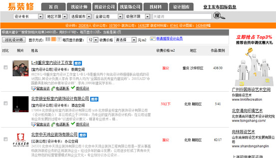 2、全站全方位形象推广 推荐设计(装饰)公司的LOGO、名称将随机显示在China-Designer.com网站总首页、设计师家园频道首页、业主频道首页的黄金位置。 China-Designer.com郑重承诺:所有推荐设计(装饰)公司将同概率随机显示在上述位置中,所有推荐设计(装饰)公司在合作网站的随机展示将不会产生额外费用。
